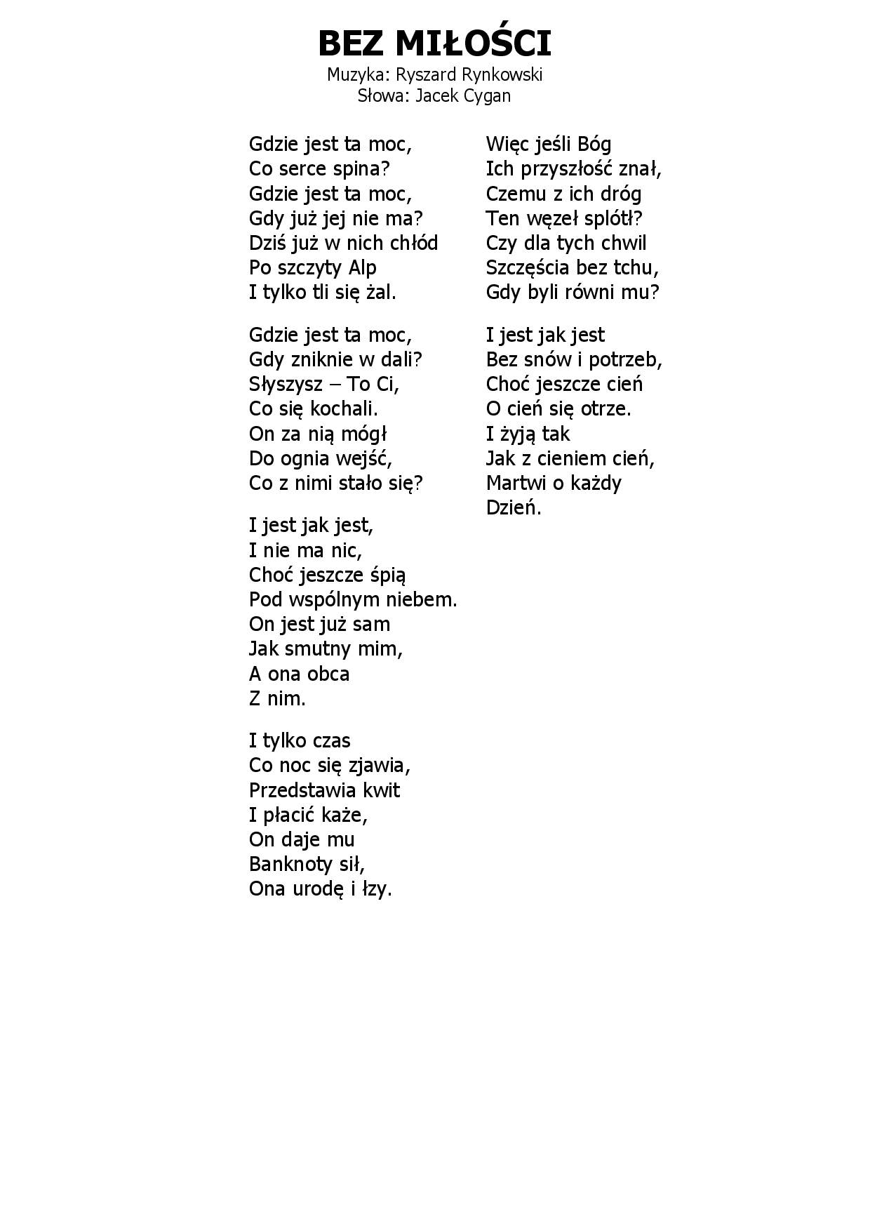 Bez miłości Ryszard Rynkowski - Jacek Cygan |