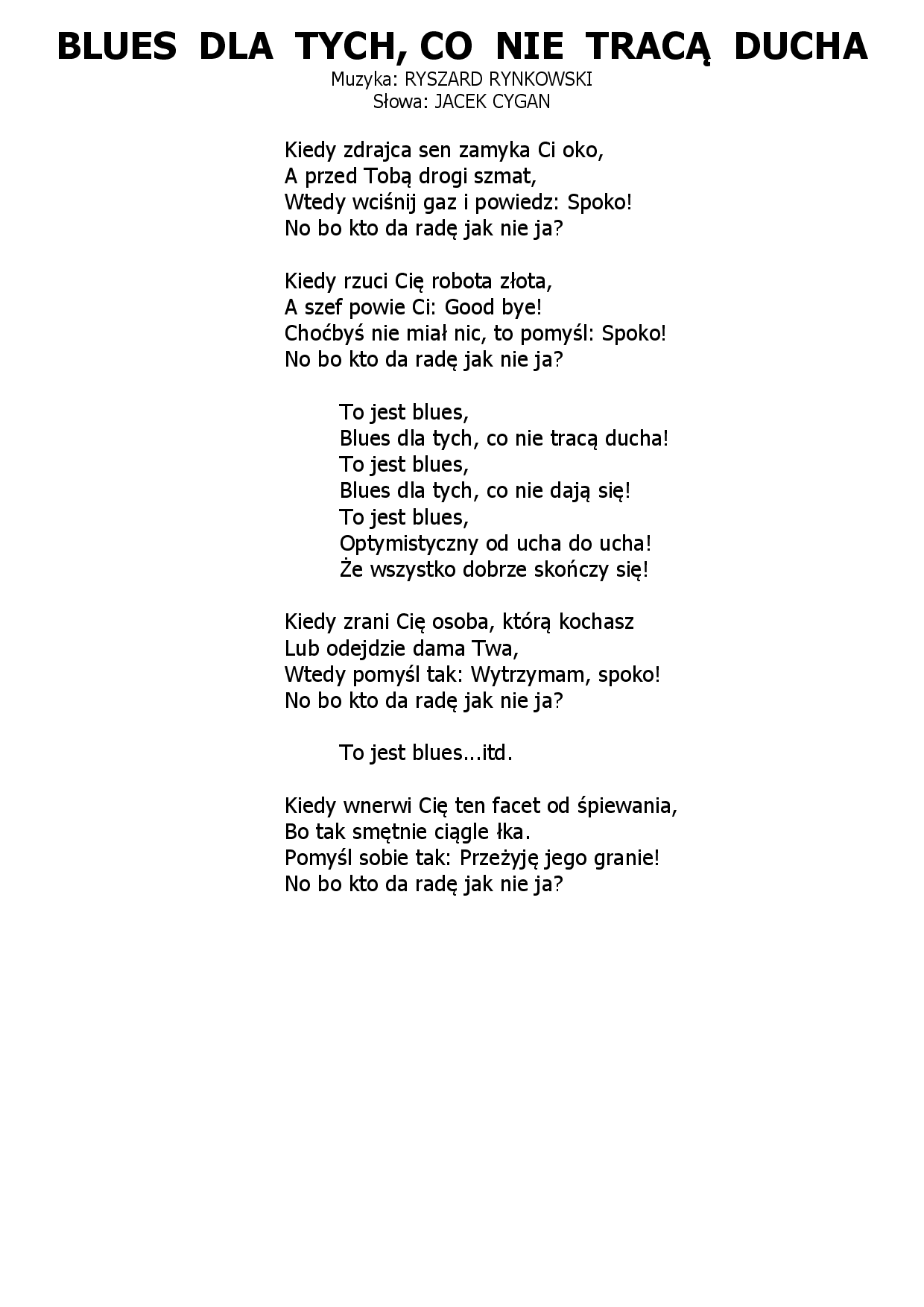 Blues dla tych co nie tracą ducha Ryszard Rynkowski - Jacek Cygan |